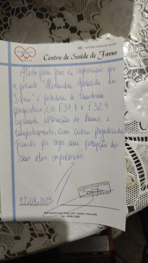 Neste sábado, 4 de outubro, o irmão de Alexsandra, Mayk Luís Melo da Silva, 32 anos, me procurou para relatar a situação delicada de saúde da irmã dentro do presídio. “Ela está muito doente, com nódulo na mama, cisto no punho e sangramento retal. Foi presa porque o advogado não justificou as infrações no uso da tornozeleira eletrônica (ela usa desde 8 de março de 2023). Em geral, ela sempre cumpriu rigorosamente os compromissos das cautelares, mas nesse caso houve uma falha. Quando falei com ela por vídeo, ela chorou muito. Está pedindo socorro e está com muito medo, porque a sua saúde só piora lá dentro”, desabafa o irmão.
